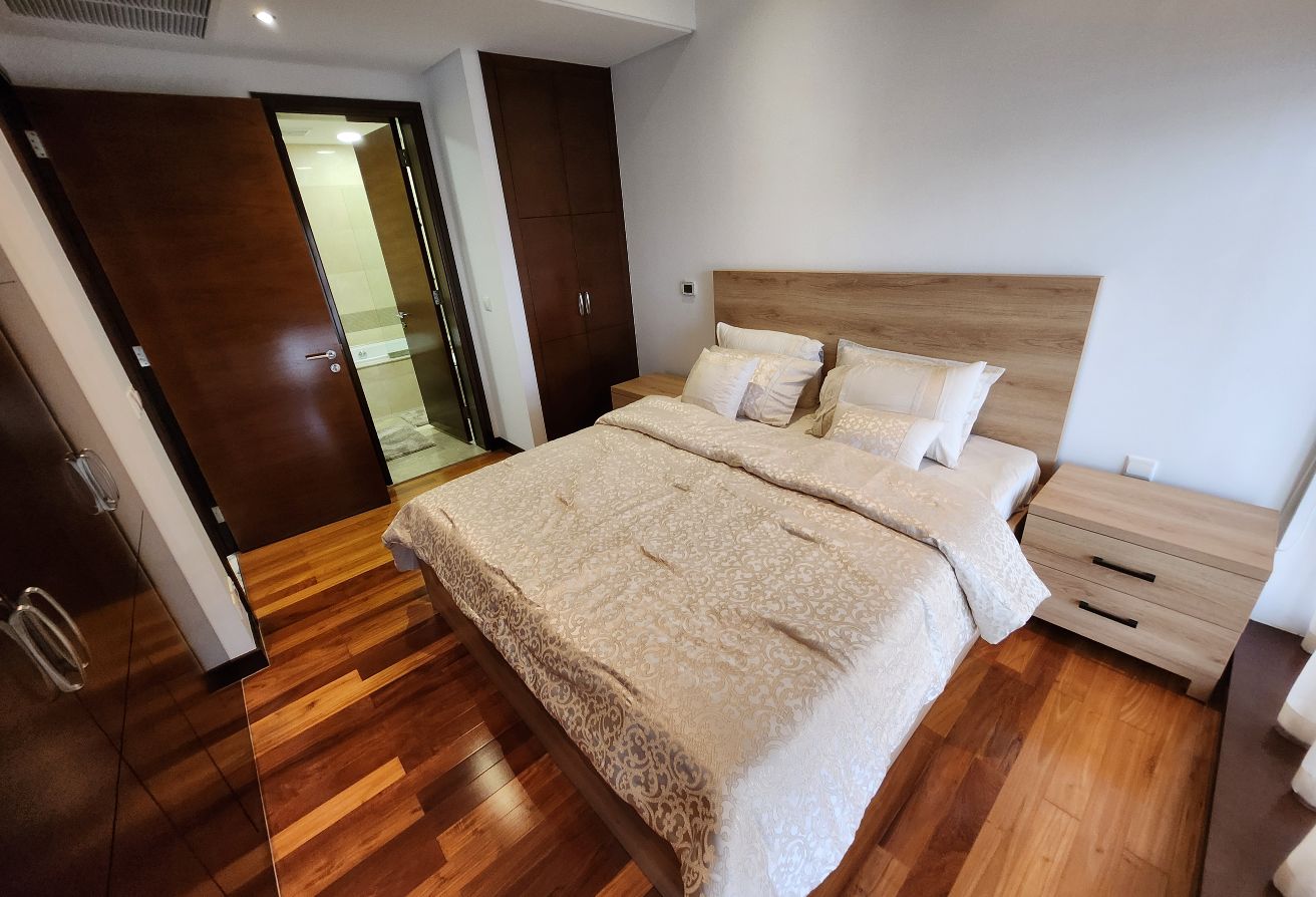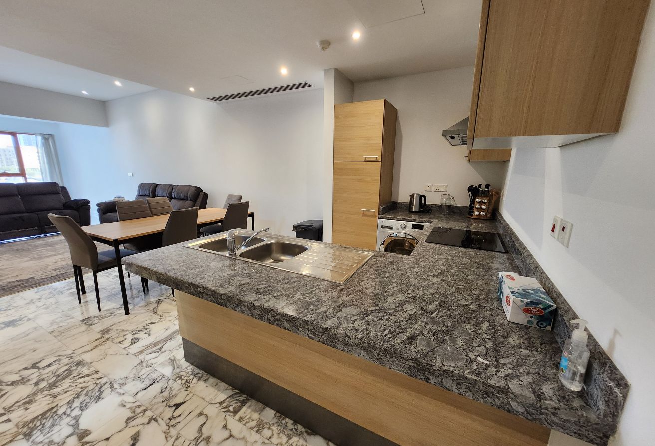 The apartment features a modern open kitchen, a spacious living area, large glass windows that fill the space with natural light, and two bathrooms—one en-suite and one for guests.